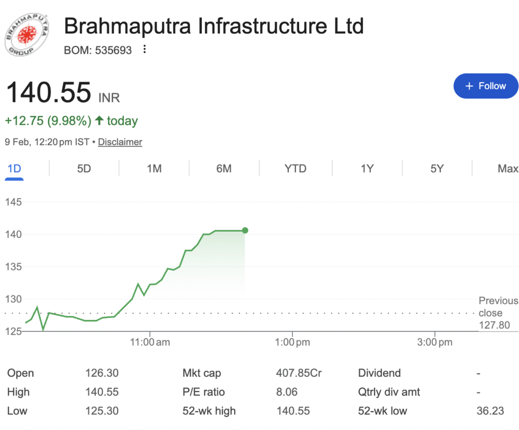 A quiet revolution is unfolding in the small-cap infrastructure space. Brahmaputra Infrastructure Limited (BSE: 535693), once a relatively obscure player, has seen its stock price rocket by over 146% in the past year and surge nearly 10% today alone. This staggering run, catapulting the stock from a 52-week low of ₹36.23 to a high of ₹140.55, demands more than a passing glance. Is this a speculative bubble or the beginning of a fundamental re-rating story? Our bottom-to-top analysis separates the signal from the noise.
