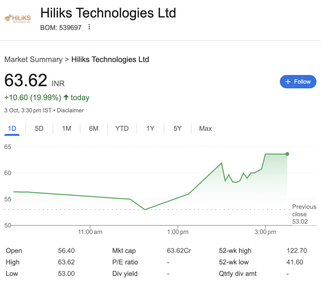 In a dramatic trading session on October 3rd, shares of Hiliks Technologies Ltd (BOM: 539697) skyrocketed, hitting the upper circuit of 20% to close at ₹63.62. This blistering rally, which saw the stock surge from ₹53.00 to its day’s high, wasn’t without reason. The company announced a monumental sub-contract order worth ₹33.39 crore, a figure that dwarfs its entire revenue from the last fiscal year.