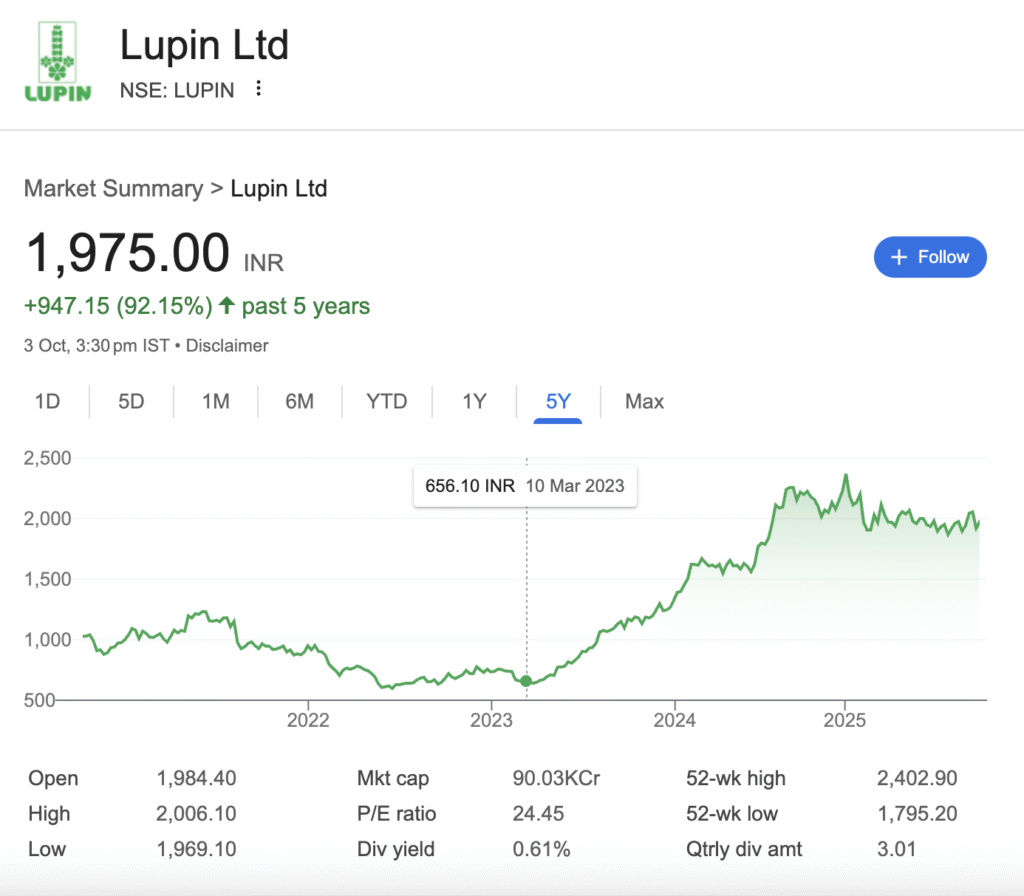 - The Trough (March 2023 – ~₹656): In early 2023, Lupin was grappling with the aftermath of USFDA observations at key manufacturing plants, pricing pressure in the core US generics market, and elevated raw material costs. The sentiment was overwhelmingly negative, baking these challenges into a depressed stock price.