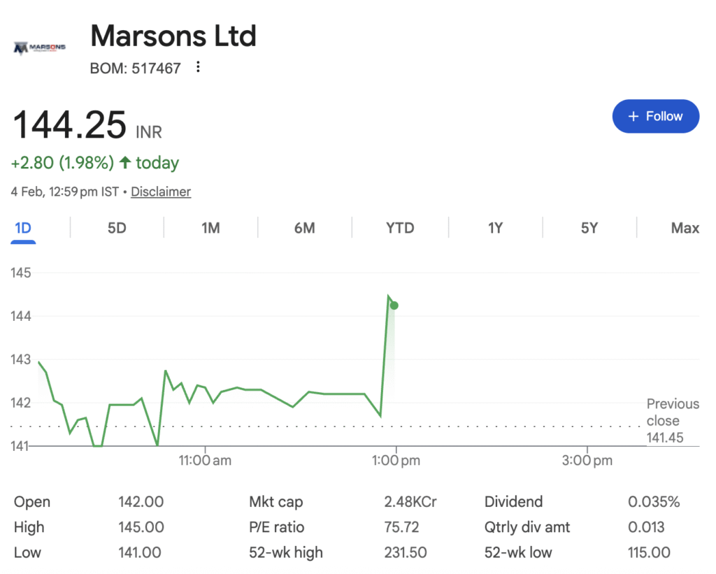 Mumbai, 4 Feb 2026 (IST) – Shares of Marsons Ltd (BOM: 517467), a player in the power equipment sector, jumped nearly 2% in intraday trading today, buoyed by a significant new order win. The stock climbed to a high of ₹145 before settling around ₹144.25, marking a gain of ₹2.80 (1.98%) from the previous close.