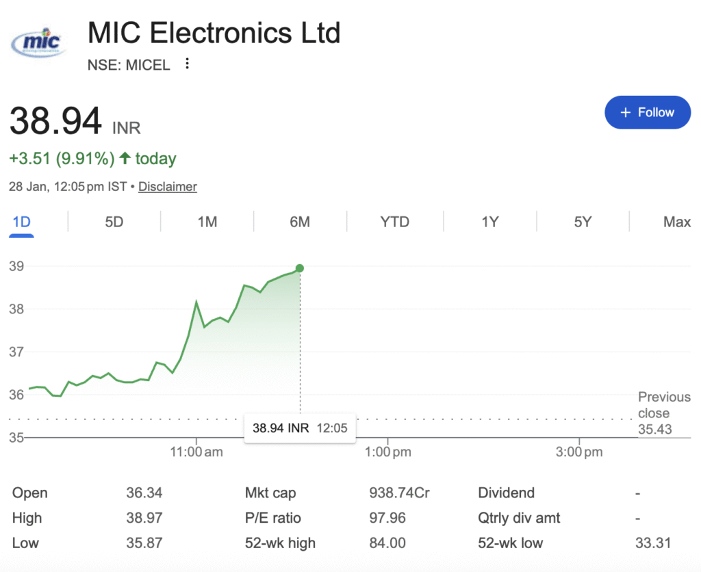 Investors responded enthusiastically to the news, driving the stock to an intraday high of ₹38.97, up from the previous close of ₹35.43. The trading volume spiked significantly, indicating strong buying interest. MIC Electronics, with a market capitalization of nearly ₹938.74 crore, has been trading at a high P/E ratio of 97.96, suggesting that the market is pricing in strong future growth expectations.