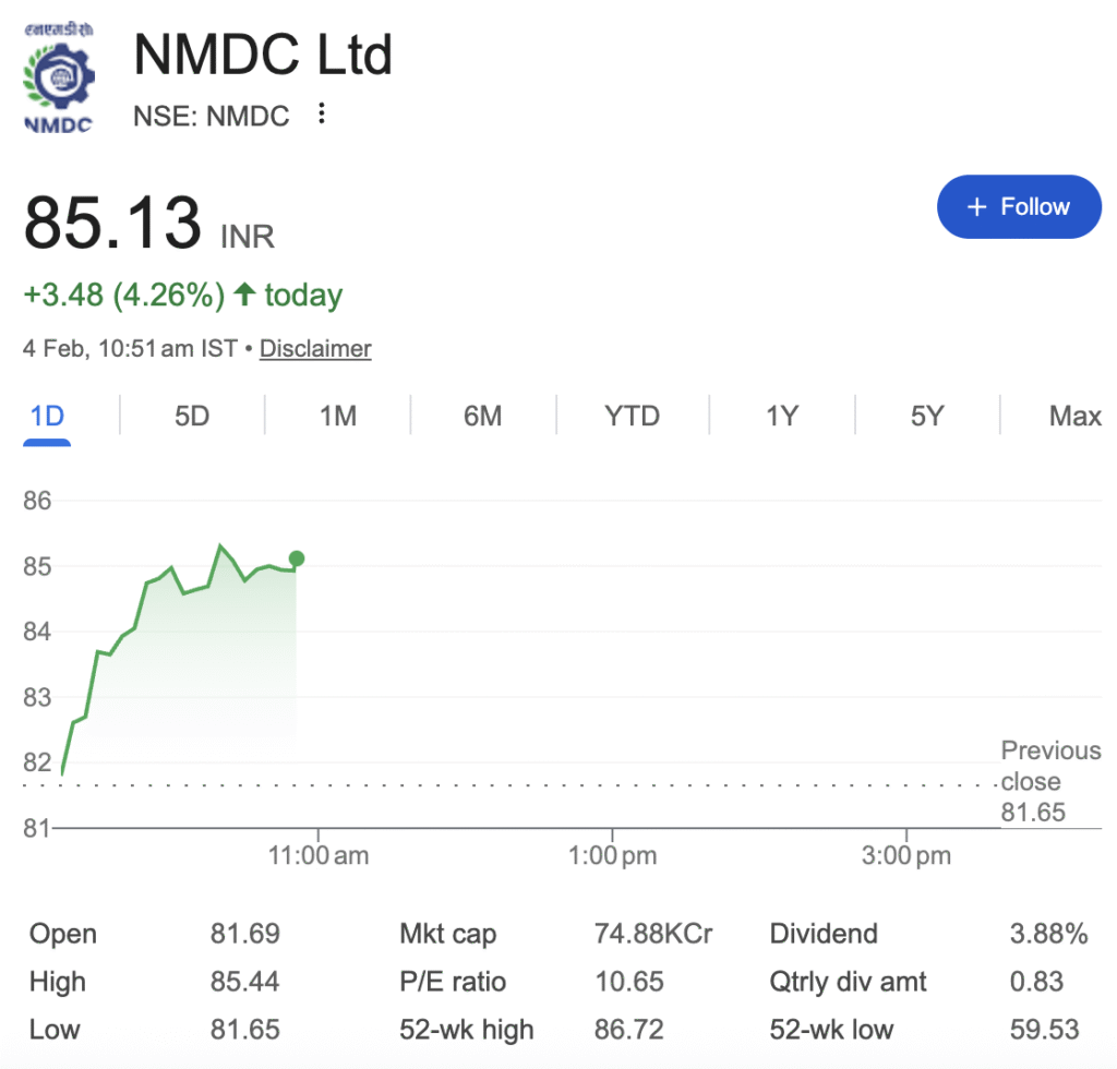 | NMDC | 10.40 | 23.08% | -0.21 | ~4.29% |