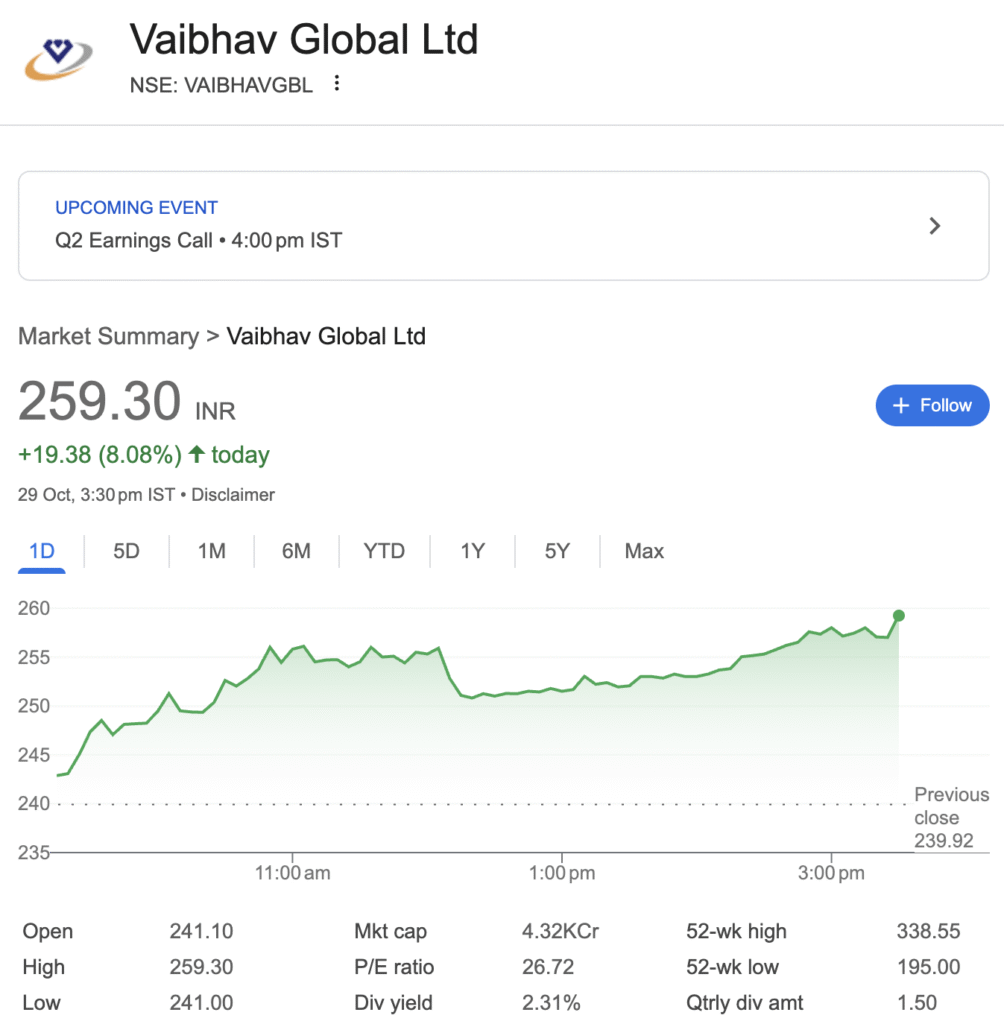 In the bustling landscape of Indian equities, Vaibhav Global Limited (VGL), a small-cap stock with a market capitalization of approximately ₹4,298 crore, often sparks curiosity among investors. This vertically integrated digital retailer of fashion jewellery and lifestyle products has carved a unique niche, serving customers in the developed markets of the US, UK, and Germany directly through its proprietary TV shopping channels and digital platforms. The company’s stock, trading at ₹259 (as of October 29, 2025), witnessed a rise of ₹19 (8%).